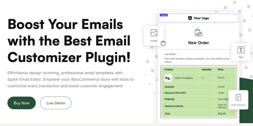 Spark Email Editor is the best WooCommerce email customizer plugin designed to help you take full control of your store’s transactional emails. With its easy drag-and-drop builder, you can design professional, fully branded email templates without touching a single line of code.