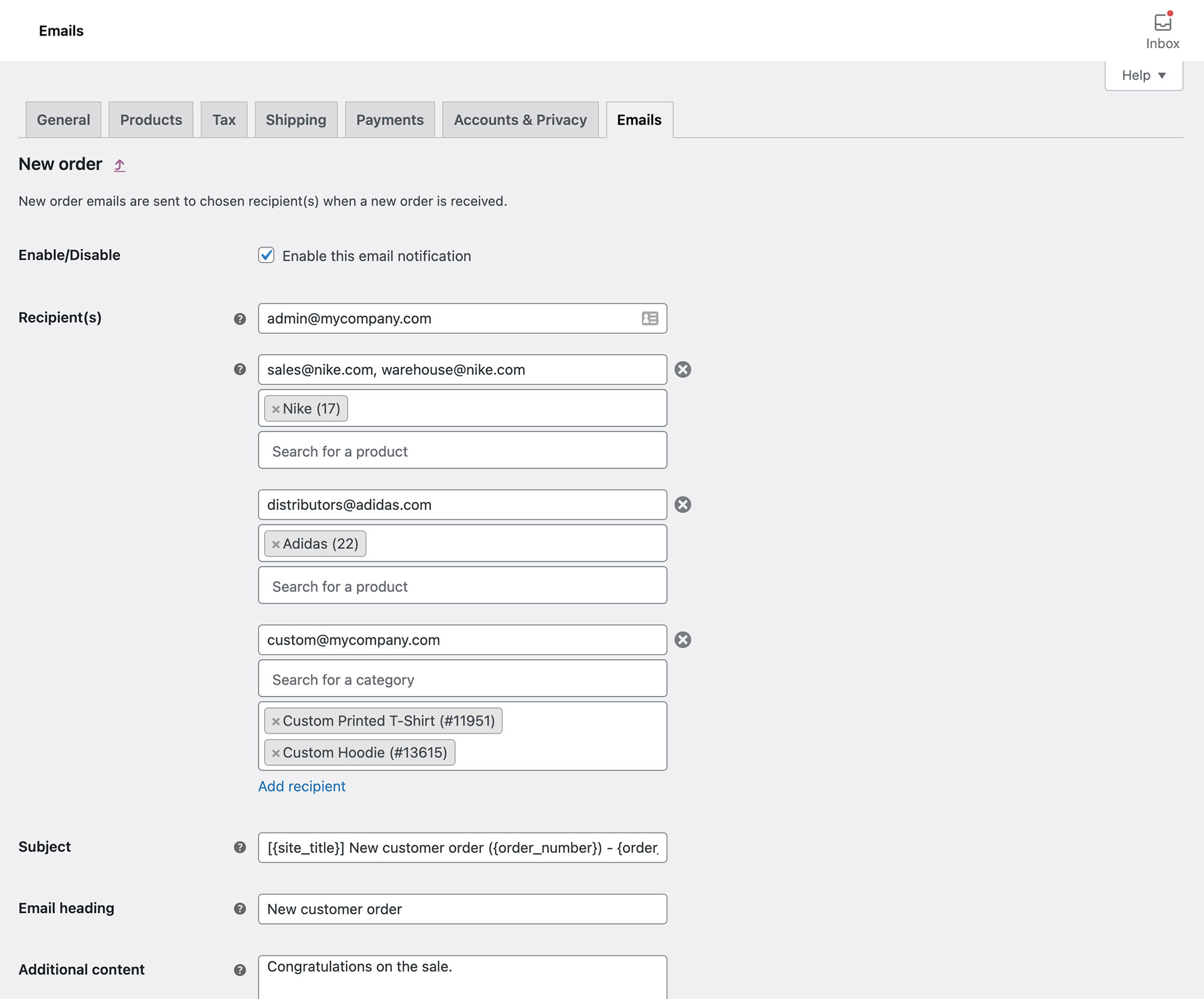 Managing WooCommerce orders in industries with custom needs can be quite challenging. Irrespective of the niche, WooCommerce Multiple Email Recipients makes it easy to send transactional emails to multiple email addresses. It lets you do this for customer and administrative emails. You can even send the order notification email to different email addresses depending on the products and categories ordered.