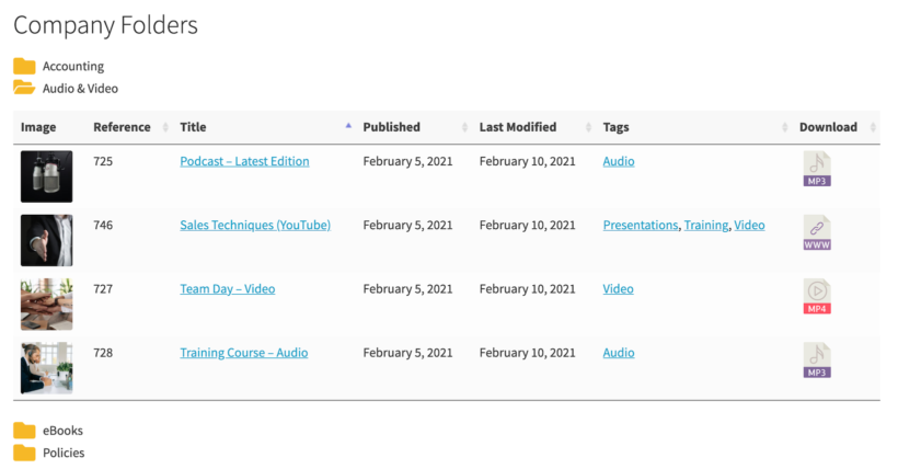 You can choose to list all documents or categorize them into folders. The plugin supports all file types and third-party URLs as well as embedded audio and video players.