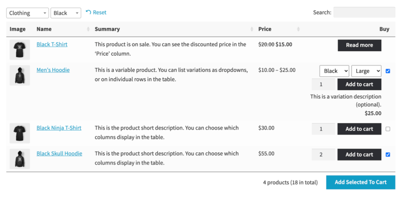 You can choose which columns to display on the front-end. The best part is that the WooCommerce Product Table plugin works for physical products, digital goods, simple products, and variable products.