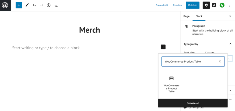 You can choose a pre-made template or start with a blank page. Next, enter a title for your page and create a new block in the Gutenberg editor. Search for WooCommerce Product Table and add it to the page.