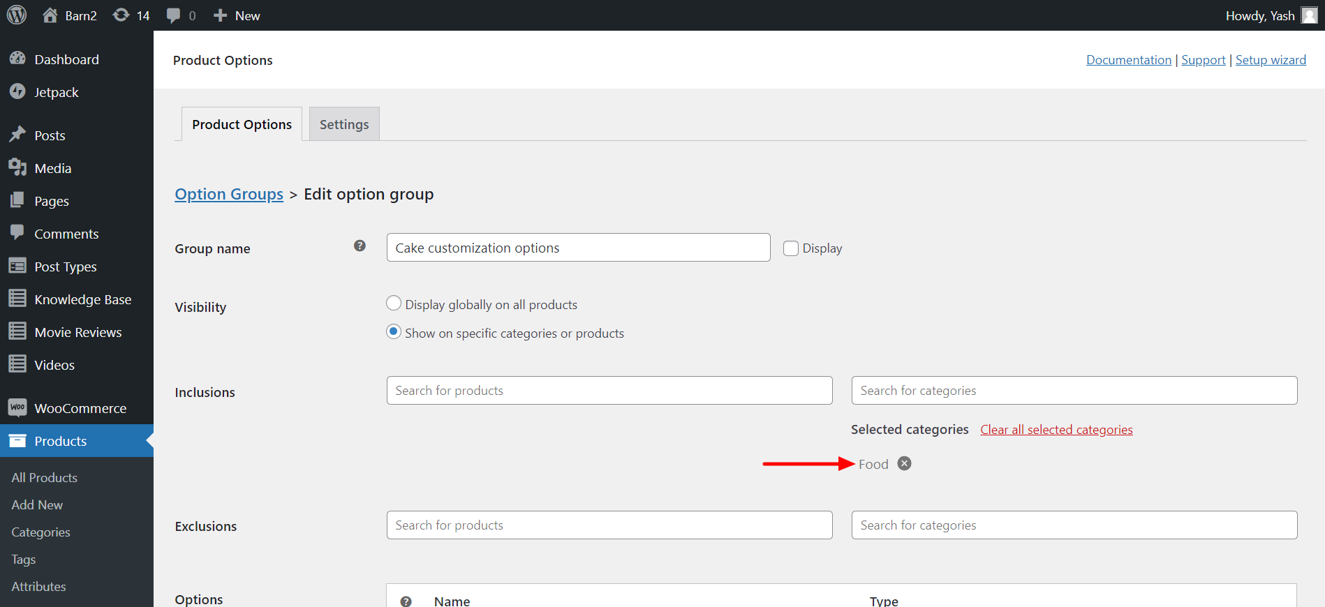 In Inclusions and Exclusions, you can select which product or category you want to assign these customization options to. I’ll select the Food category in inclusions for my case, so all cake products will show these customization options.