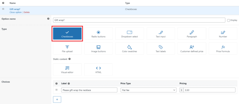 3. Under the choices tab, add the checkbox label, the price type, and pricing. In our case, the label reads, “please gift wrap the necklace.” Once selected, it applies a fixed $3.50 fee.