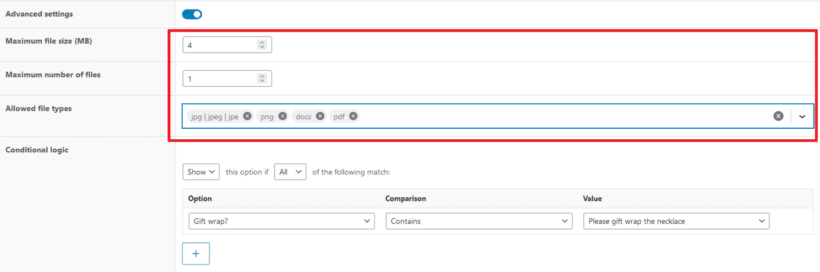 3. Just like custom wrapping paper, you may also need to set the maximum number of files, the maximum file size, allowed file types, and conditional logic.