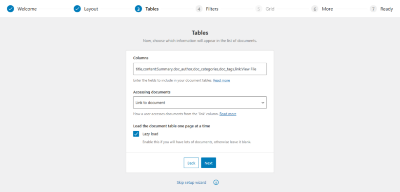 - The first step in the setup wizard is to choose a default layout for the Google Doc library. While both table and grid layouts look great, I recommend opting for the table layout since it is straightforward and is more convenient for showcasing a lot of additional metadata.