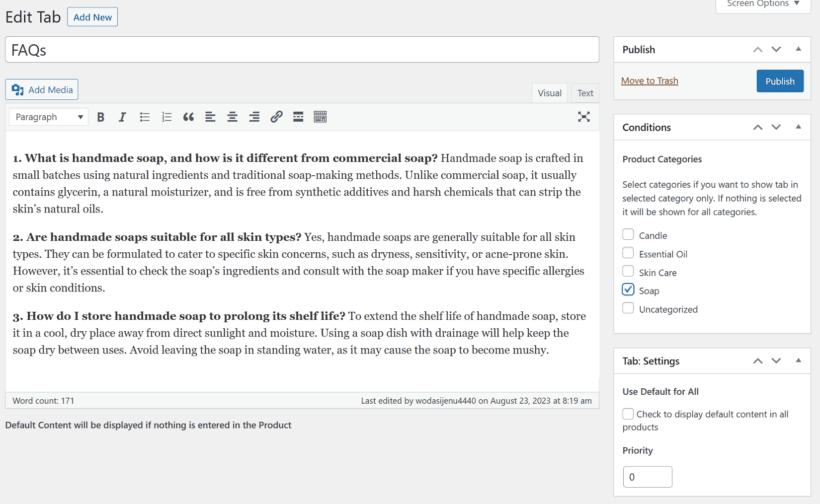 To create a custom tab, navigate to the Products → Product Tabs and click the Add New button. Here, you can set a title, content, and icon for your new tab. Additionally, you can define its visibility settings, deciding whether the tab should appear: