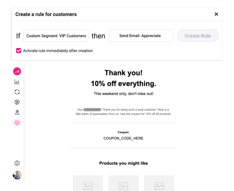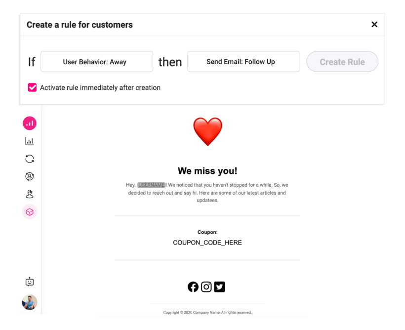 In Growmatik, use one of the predefined segments such as User Behavior > Away and set a time period of inactiveness or create a more advanced segment in the People section using a combination of the metrics we explained in the table. For the action, choose Send Email and then create the content of your follow-up email. Use dynamic content such as name, smart related products and an exclusive discount coupon to personalize your email.