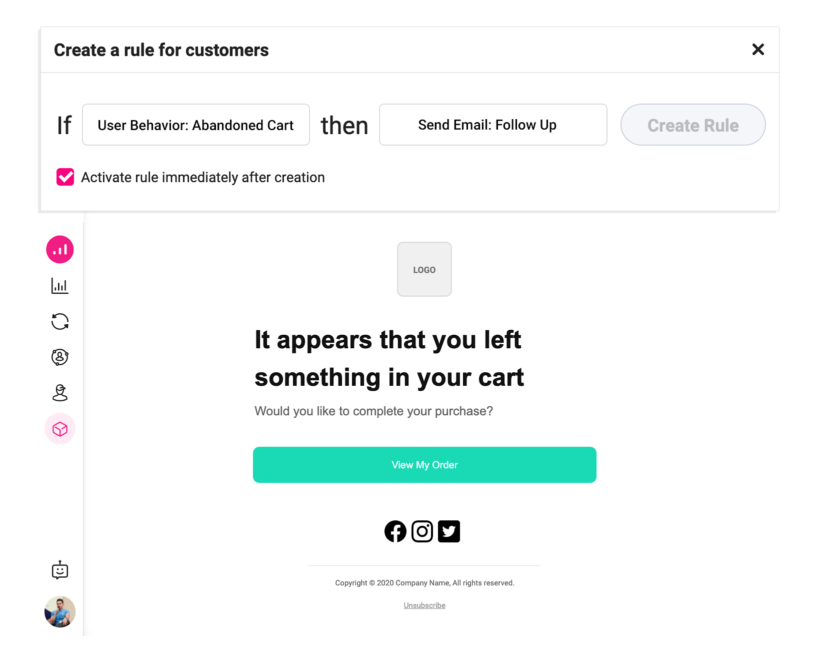 In Growmatik, set the condition to User Behavior > Abandoned Cart and set the action to Send Email. Once the email builder opens, use your creativity to style it, and don’t forget to add the customer’s name using the Dynamic tags options.