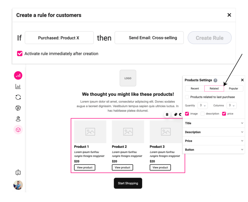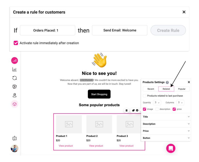 Use the related product elements in the Growmatik email builder to automatically put related products inside your email and automate sending them to the customer right after purchasing a product.