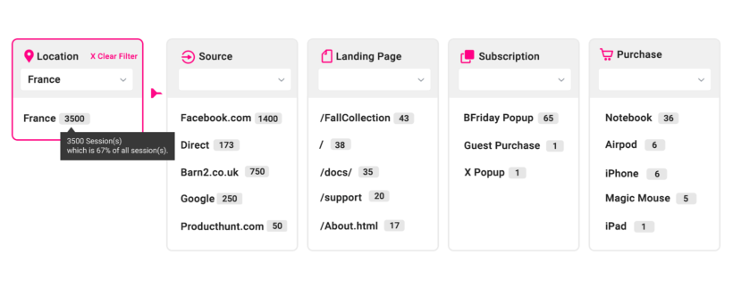 Select a dimension and all other parts of the journey gets ordered accordingly showing what users in the selected dimension have done on the website. For example, if we select France in the location dimension, the journey taken by French visitors gets displayed in adjacent columns.