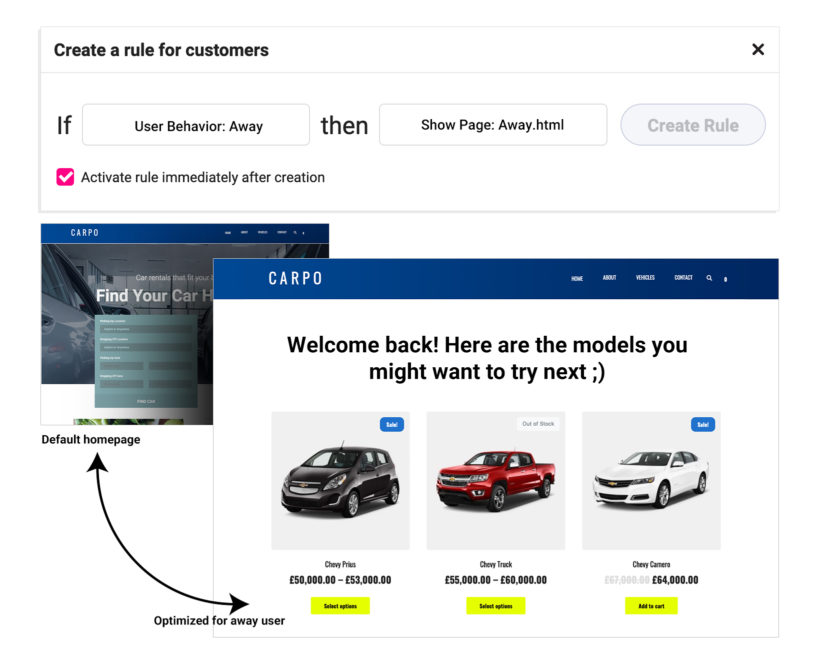 In Growmatik, using the same method as re-engagement emails, find the away customers and automate personalizing your landing page using the Personalize action.