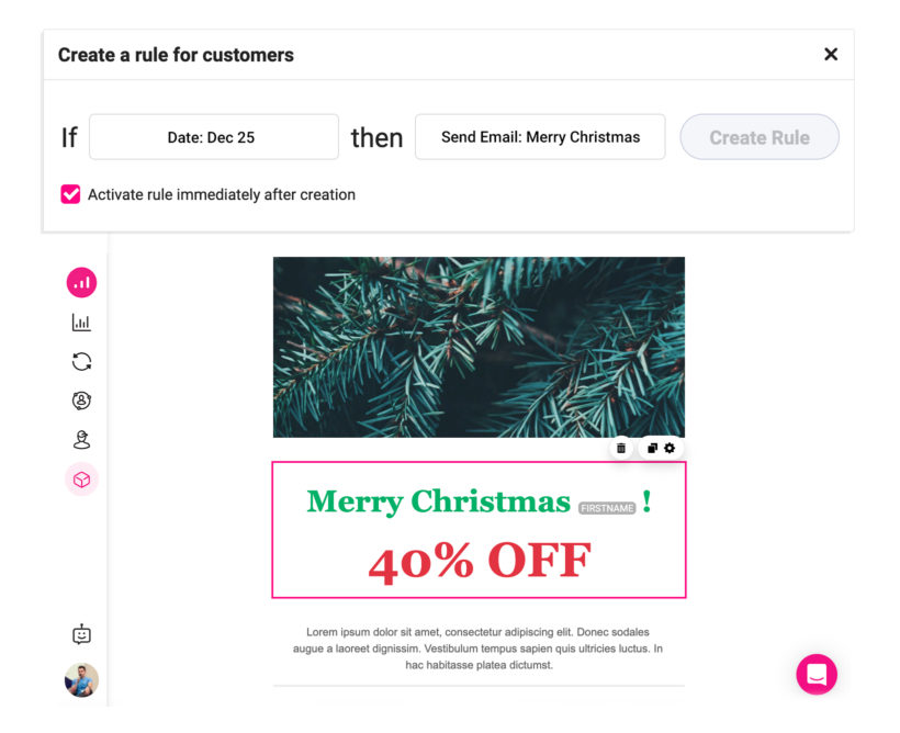 Use the Growmatik Date condition with the Send Email action to automate sending emails on important dates. Customize the email in the email builder and make sure to personalize it using Dynamic tags.