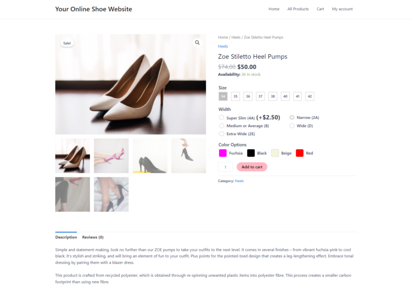 Here's how color swatches look on a demo WooCommerce shoe website: