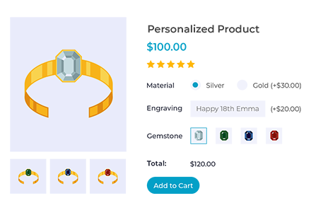 You can create product add-ons using dropdowns, checkboxes, text boxes, file uploads, and many other field types. Each option appears exactly where customers make purchase decisions - above the add to cart button where they can't miss it.