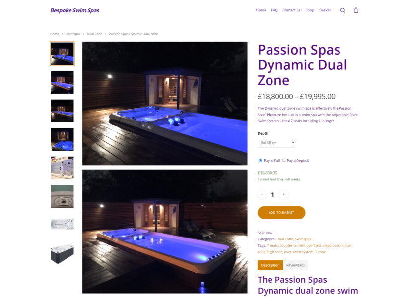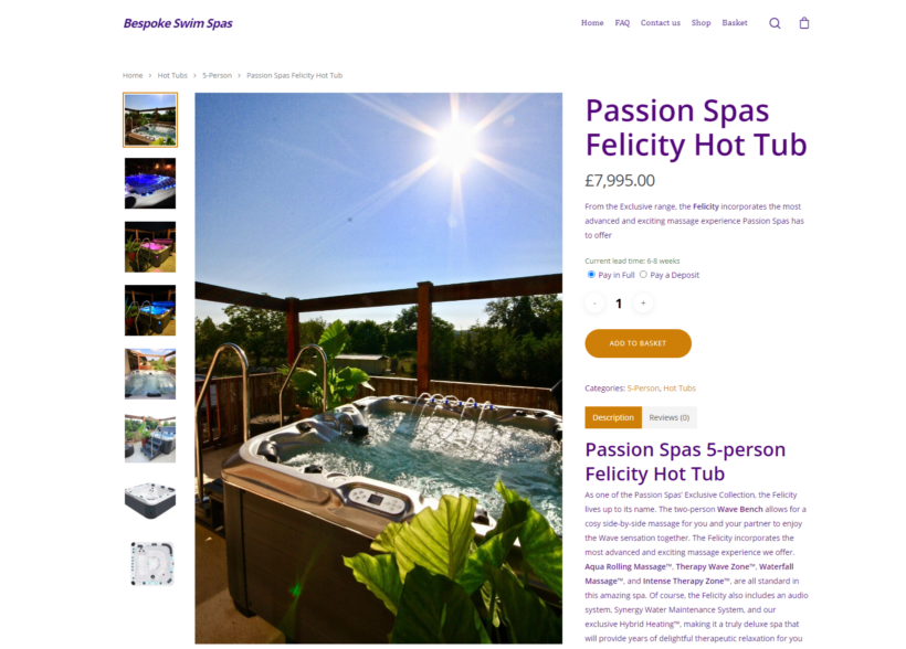 Bespoke Swim Spas use the WooCommerce Lead Time plugin to set a default lead time for their products. This is typically around 6 to 8 weeks at the moment.  The lead time appears under the product price and description. This lets customers know right away how long it will take for the product to arrive. In addition, it allows them to make an informed buying decision.