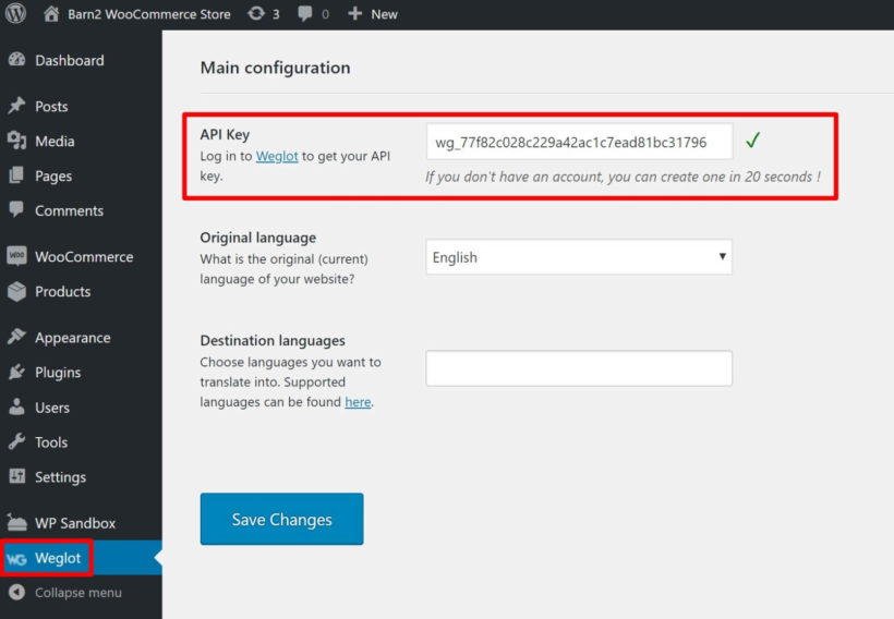 Copy the value of your API key. Then, go to the Weglot tab in your WordPress back-end and paste the API key into the API Key box: