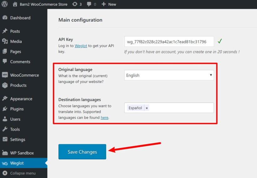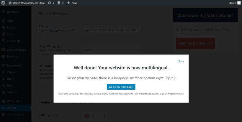 Once you've made your choices, click the Save Changes button to make your multilingual WooCommerce store live. You should see a confirmation message telling you that Weglot has translated your store: