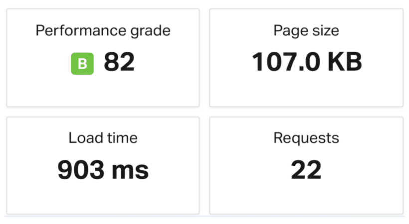 An overall performance score of 82/100 or grade B. Also a loading time of a shade just under 1 second.