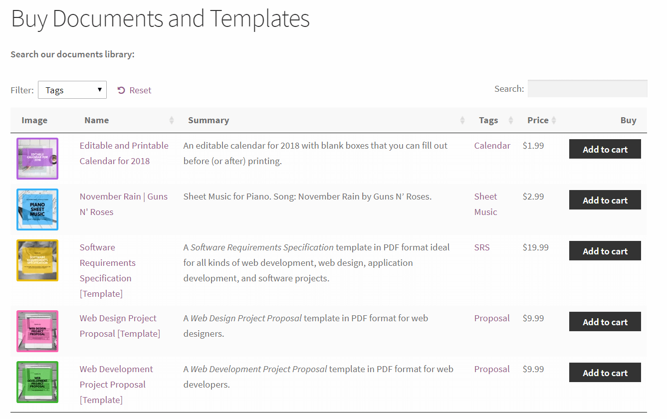 Although WooCommerce comes with the free Storefront theme in addition to some built-in options for displaying your products on the front-end, these layouts aren’t suitable for selling documents. If you’d like to go for a more professional look, it’s a better idea to list your documents in a table-style layout.