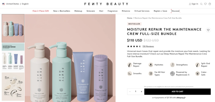 • Complementary product sets. Combine related items that form a cohesive solution, such as starter kits for hobbies or skincare routines. A real-life example is Fenty Beauty’s Moisture Repair the Maintenance Crew Full-Size Bundle priced at $110 instead of $122. Labeling it as a bestseller highlights its appeal and potential for revenue growth.