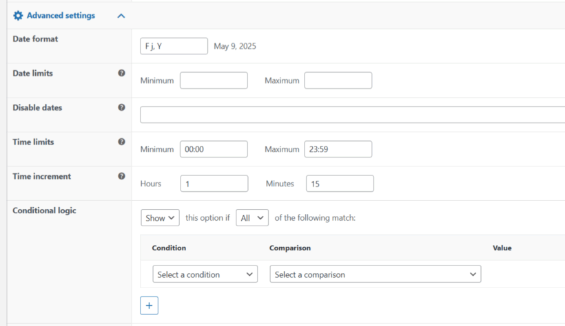Expand the "Advanced settings" collapsible tray and configure settings to apply conditional logic to present time slots only after customers select specific dates. For this example, I want to show time slots after customers select their desired dates.