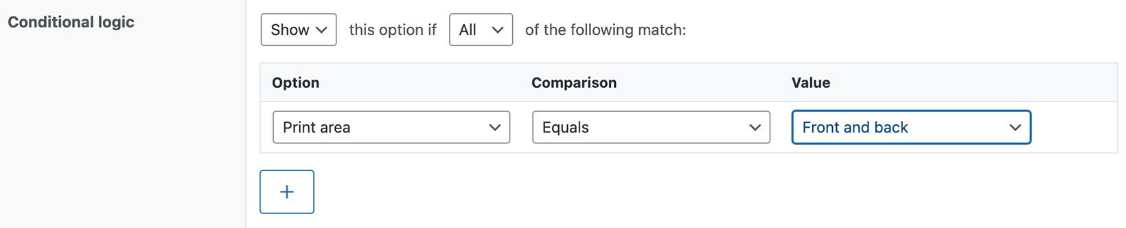 Lastly, the WooCommerce checkbox variations let you add conditional logic in order to show and hide other product options. Scroll down to Conditional Logic section in the Advanced options and set up your conditional variations as needed.