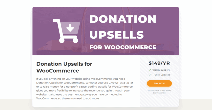 The donation upsell for WooCommerce is part of the Plus, Pro, and Agency plans. The Plus plan of GiveWP costs $349 per year and comes with all the premium add-ons GiveWP has to offer. You can also go for the Pro plan for $499 per year and get access to VIP Support and peer-to-peer fundraising. If you would just want the Donations Upsells for WooCommerce, you can get it for $149 per year.