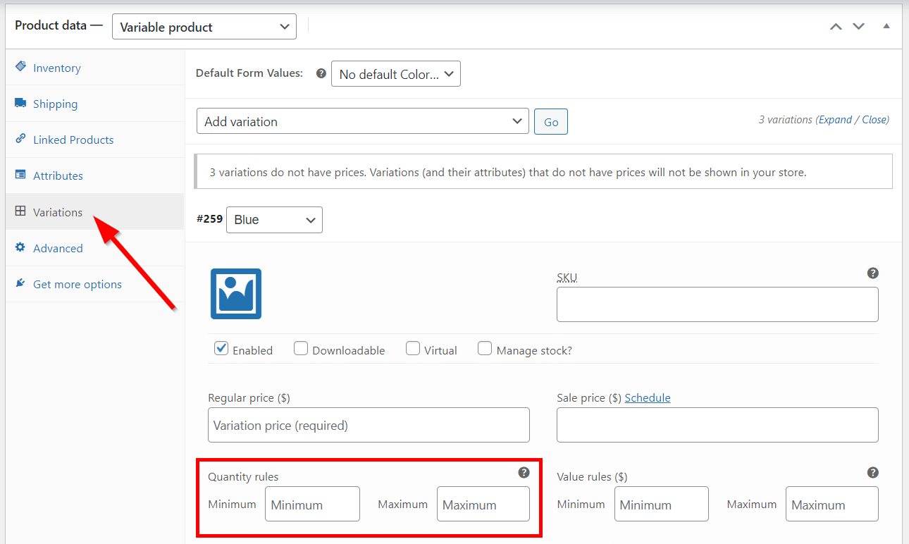 For variations, navigate to Products → Edit Product → Product Data section → Variations, select a variation, and find the Quantity Rules settings there.