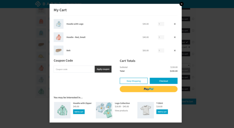 One-click upsells on the WooCommerce product page - After adding a product to their cart, the customer reviews their selections. They can either do this on the default WooCommerce cart page or - ideally - in a popup cart directly on the product page. This is another opportunity for upselling. You already know what is in the customer's cart and can display related items in the cart for them to add with a single click.