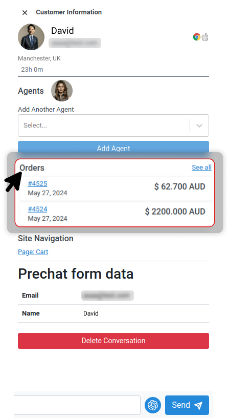 Order Details & Assistance: View customer and order details during chats, and search and suggest WooCommerce products to guide customers through the shopping process.