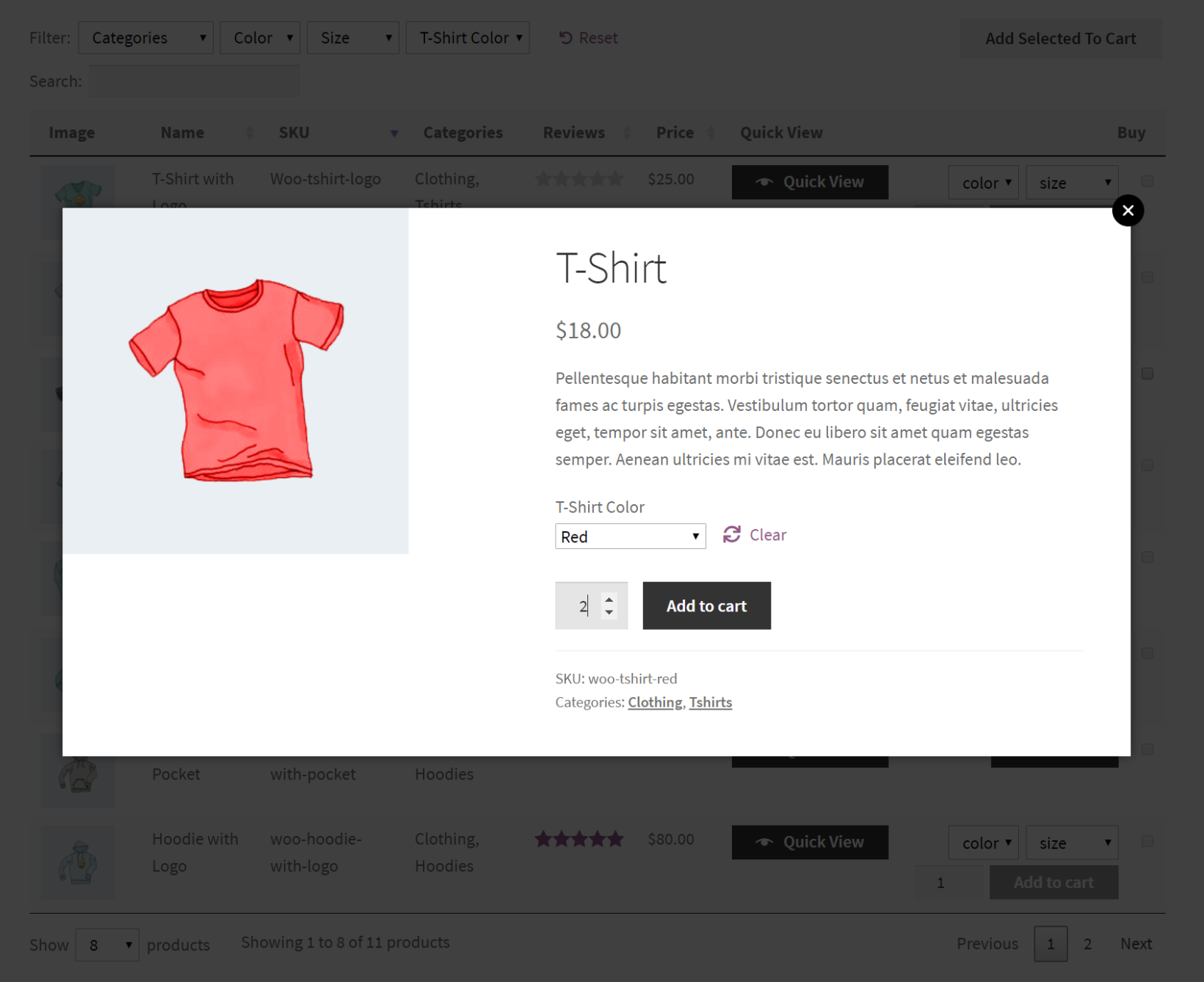 With this plugin, you add your product variations as usual. You then go to Products → Product Options and create product options by selecting the variations you already created. Select an alternative style for them, such as checkboxes, radio buttons, clickable images, text labels, and so on. Another benefit of this plugin is that you can use conditional logic to show/hide variations depending on the customer's other selections. For example, if you want to add gift wrap options to a product then you could add a "This is a gift" checkbox which customers can click to reveal the hidden gift wrapping options. The customer can then choose a wrapping paper variation by clicking on a picture of their preferred design. While the WooCommerce Product Options plugin can display product variations in more interesting ways, that's not all it can do. This product add-ons plugin provides a way of creating product options without using variations at all. When you create options using this method, instead of using variations, you create the options directly in the plugin. This can be more flexible and easier to use than the interface for creating variations. It also gives you, a wider range of display styles, such as text fields, date fields and file upload fields, which aren't possible with actual variations. This opens the door to selling types of variant which simply aren't possible using WooCommerce product variations. Let's go back to our gift wrap example - you could add a text field allowing customers to type a message to be printed on the gift label. Product add-ons also bring lots of other types of flexibility that you don't get with WooCommerce variations: When it comes to WooCommerce product variations, filtering by specific attributes can greatly enhance the shopping experience for your customers. By using the WooCommerce Product Filters plugin, you can easily add attribute filters to your store, allowing customers to quickly find products that match their preferences. The WooCommerce Product Filters plugin offers a wide range of product filters, including categories, attributes, color, tags, custom taxonomy, price, ratings, and stock status. With the ability to display filters such as dropdown lists, checkboxes, radio buttons, labels/tag clouds, images, or color swatches, you can create a user-friendly shopping experience that increases the time customers spend in your store. Ultimately, this leads to increased conversion rates and customer loyalty. Here's how you can filter by product variation using the WooCommerce Product Filters plugin: Looking to learn more about how the WooCommerce Product Filters plugin can help you filter by product variation? Check out this helpful article on How to filter by variation using different methods. Here, you'll find detailed instructions on how to use the plugin to filter by variation, along with other useful information on this powerful tool. By default, WooCommerce product variations only appear on the single product page. What this means is that customers have to click through to the single product page from the main shop page to view and select variations. This makes the main purchasing user flow unnecessarily long. The good news is that the WooCommerce Product Table plugin provides superior ways to display product variations on the front-end. This way, you can allow customers to select and add variations to their shopping carts from just about anywhere in your store, not just on the single product page. More specifically, you can choose to list variations in two different ways: Another way to let customers select product variations away from the single product page is by displaying them as dropdowns in a quick view lightbox. This is possible with the WooCommerce Quick View Pro plugin. You can use the WooCommerce Quick View Pro plugin together with the WooCommerce Product Table plugin to add quick view buttons directly to the table layout. The key benefit of this is that you can display additional product details in the table layout while giving customers the option to use the quick view lightbox to select variations. In addition, you can use the WooCommerce Quick View Pro plugin to add quick view buttons directly to your main shop page. This way, instead of navigating to the single product page to select and add variations to the cart, customers can simply use the quick view lightbox. The key benefit of this approach is that they can continue where they left off once they’ve added a variation to their shopping cart. Have you noticed that if a product's variations are different prices, then WooCommerce displays them as a range? (E.g. $50 - $100.) This is ok for some products, but can lose you sales by putting customers off. For example, showing the top and bottom price makes it difficult for customers to predict what they will pay, and can make the product look more expensive. The solution is to install the WooCommerce Variation Prices plugin. This easy-to-use plugin lets you change the variation price format to anything you like. This might be "From $50", "Up to $100", or replacing the dash between the low-high price with another word or symbol. You can list the price of each variation individually. Maybe you need to create a completely bespoke variation price format with your own format, such as "$10 per kg". As well as replacing the variation price range, there are further settings for changing how prices are displayed: Variation Prices is a very simple plugin, but it adds a very important feature to your WooCommerce product variations. The ability to control how variable product prices are displayed can make a big difference to your sales. After all, customers are more likely to buy products when the prices are displayed in a way that emphasizes what good value they are. WooCommerce product variations make it easier for online store owners to sell different versions of the same product without having to add it as a separate product. It als