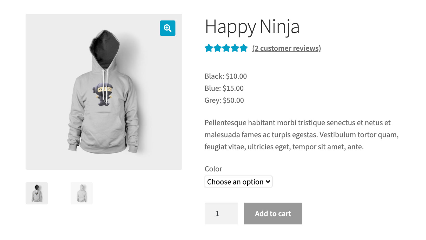 Out of the box, the free WooCommerce plugin lets you add as many “options” (i.e. variations) as you’d like to each WooCommerce product. Customers can select the variation they’d like to purchase from the single product page and add it to their cart.