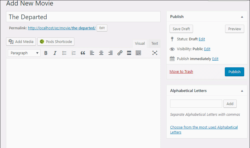 Now, if you go to add new content using regular posts or your chosen custom post type, you should see the new Alphabetical Letters taxonomy.