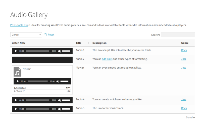 For example, if you want to create a searchable audio library on your website, such as a podcast, you can use the Posts Table Pro plugin. This plugin can display the default WordPress shortcode in a grid format with advanced table options such as search, filter, and even sorting.