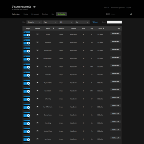 Along with the audio preview column, there are extra columns to display everything a customer needs to know when choosing the music they want to buy. This includes the name, designer, beats per minute (BPM) and price. There are hundreds of tracks available, so customers can filter the table by category, tag, key, or BPM.