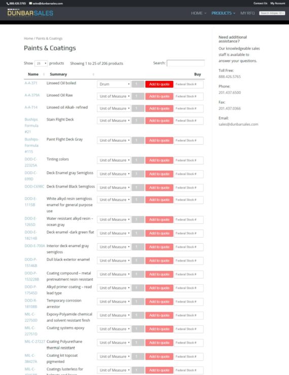 Dunbar Sales have enhanced the product table's functionality with some third party plugins. An Add to Quote plugin allows customers to request a quote. The WC Fields Factory plugin adds an extra text field for customers to enter the federal stock number for each product.