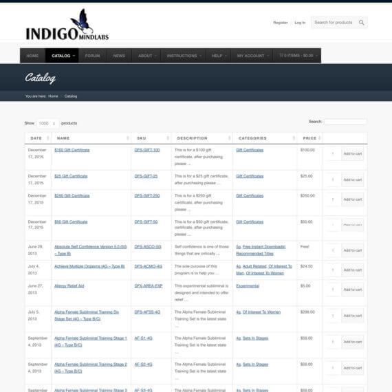 Indigo MindLabs use WooCommerce Product Table as an e-commerce product list plugin. WordPress WooCommerce websites all over the world use it to list their e-commerce products in a compact and interactive format. There are many uses for product tables, and Indigo MindLabs use them to list their subliminal programs and gift certificates for sale.