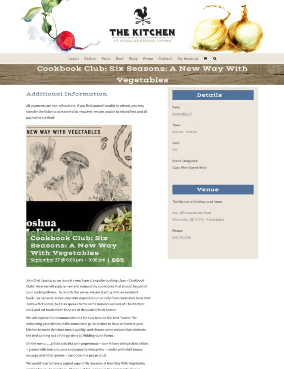The Kitchen at Middleground Farms is a cooking experience for foodies, set on a working farm in Oregon, USA. The Kitchen offers a range of cooking events from making pasta to using pressure cookers and everything in between. They use our Posts Table Pro plugin with Events Calendar to sell cookery courses in WordPress.