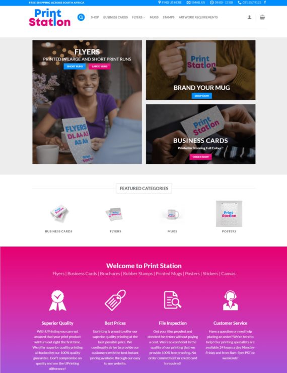 Print Station is a print house based in South Africa. They specialise in short print runs of digitally printed flyers, business cards and mugs.