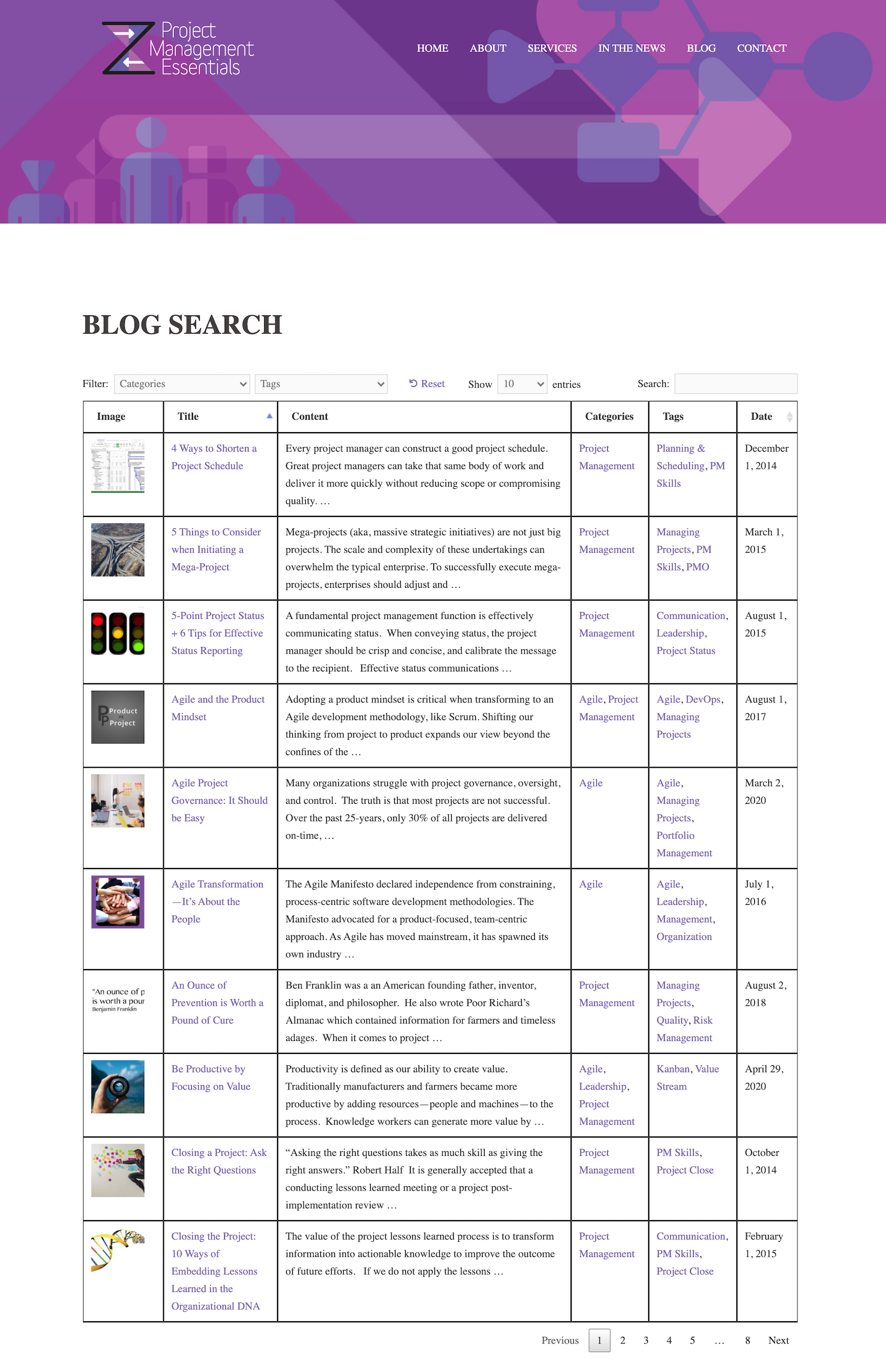 Project Management Essentials displays a variety of information about each blog post in their blog post index including an image, title, content, categories, tags, and date. Visitors can sort the articles by title or by date published.