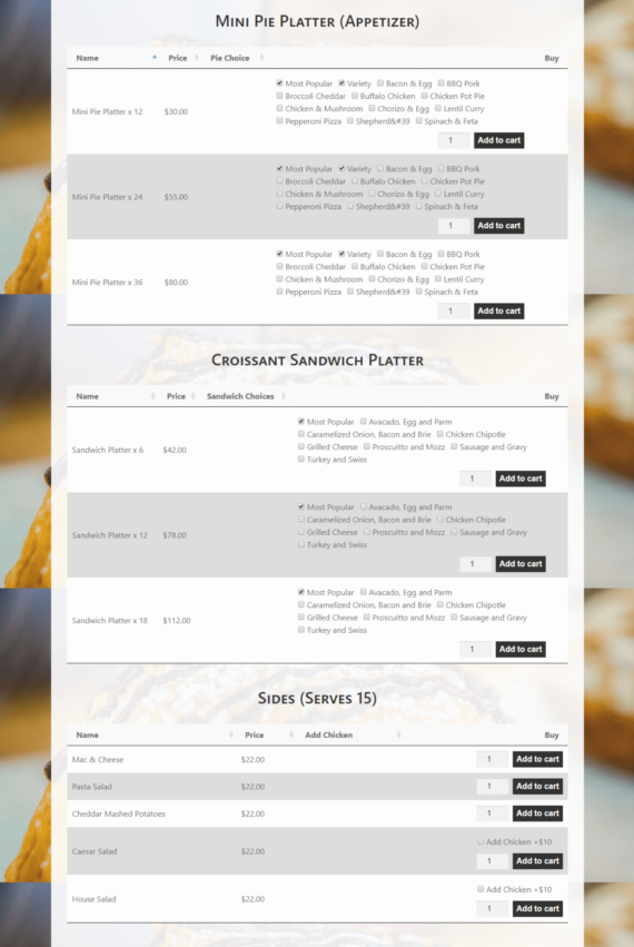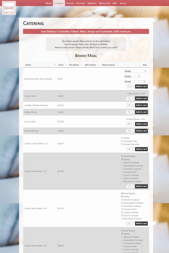 Squarz wanted to make it easy for customers to place larger orders online. Like many food businesses, they installed the WooCommerce Product Table plugin on their catering page. It allows Squarz to list their full selection of pies, pastries, salads and drinks in a bulk order form.