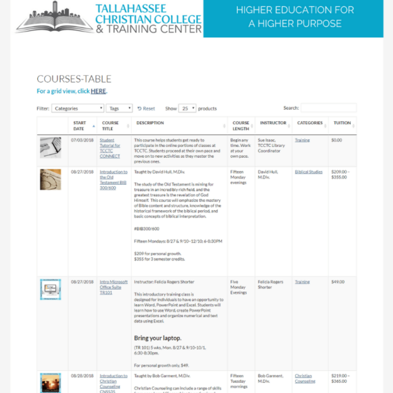 Using the WooCommerce Product Table means that students are able to quickly filter the table in several ways. The table has multiple columns including the course start date, instructor and tuition fees. Students can sort the table by category or tag. When a student wants more information or to register for the course, they just have to click through to the product page.