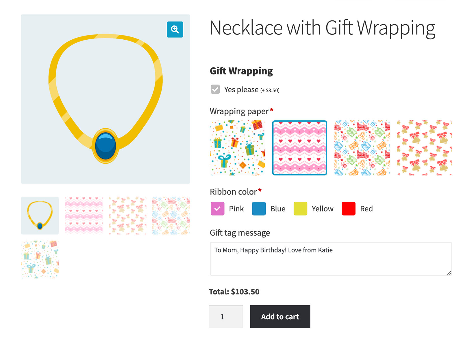 For example, the following screenshots show how we added a gift wrap option to a product. The product page loads with only one add-on visible: "Gift Wrapping." When the customer clicks the "Yes please" checkbox, the other gift wrap product add-ons appear underneath using conditional logic.