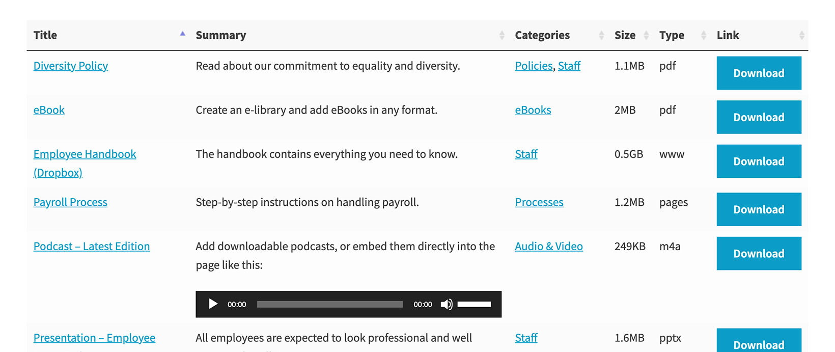 This is the default option and lists all your documents together, regardless of their category. You can disable folders on the plugin settings page, or by adding folders="false" to the shortcode, for example: [doc_library folders="false"]